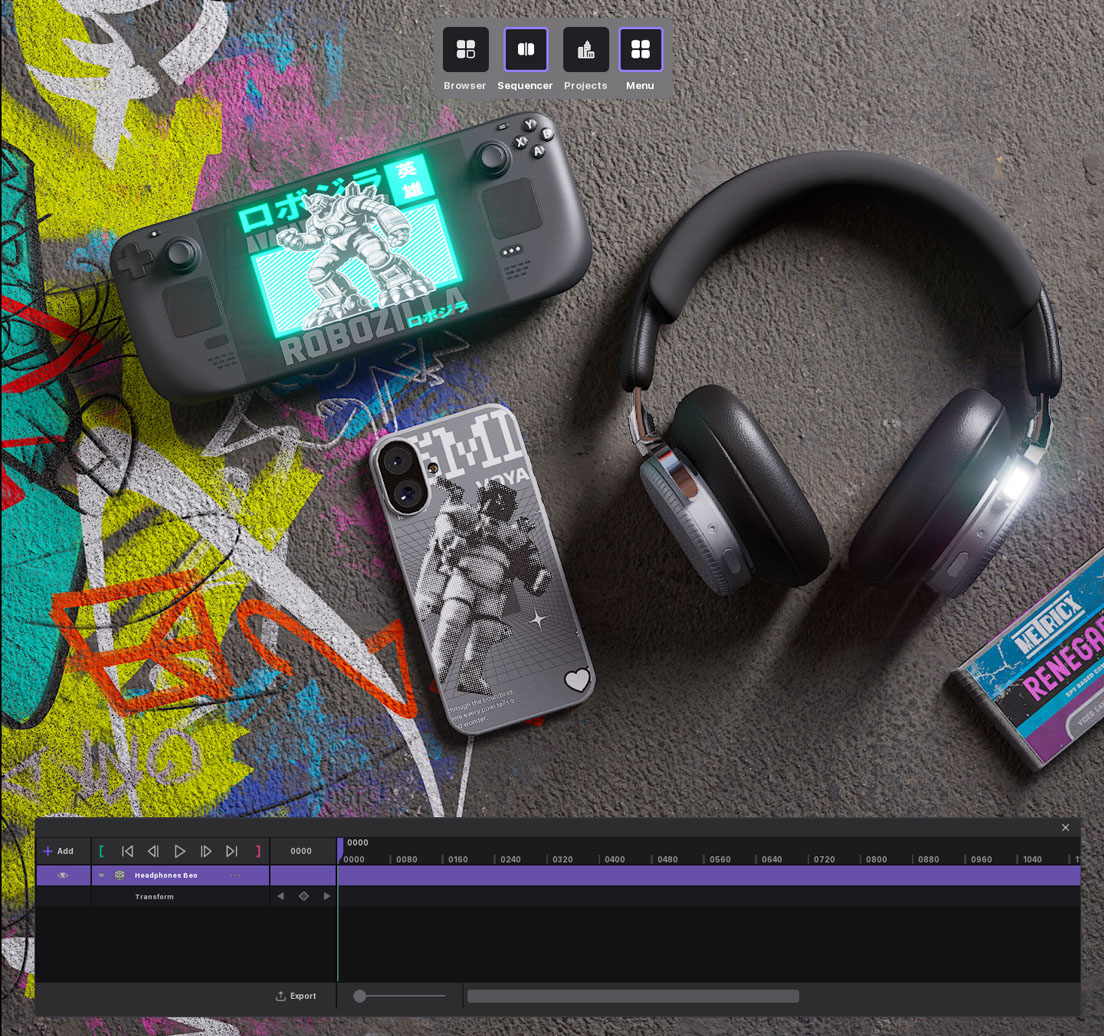 Spatial Stage includes over 500 drag-and-drop assets, like furniture, electronics, clothes, cars, packages, lights, plants, and more. Use decals to add logos, textures, or scratches to any surface.